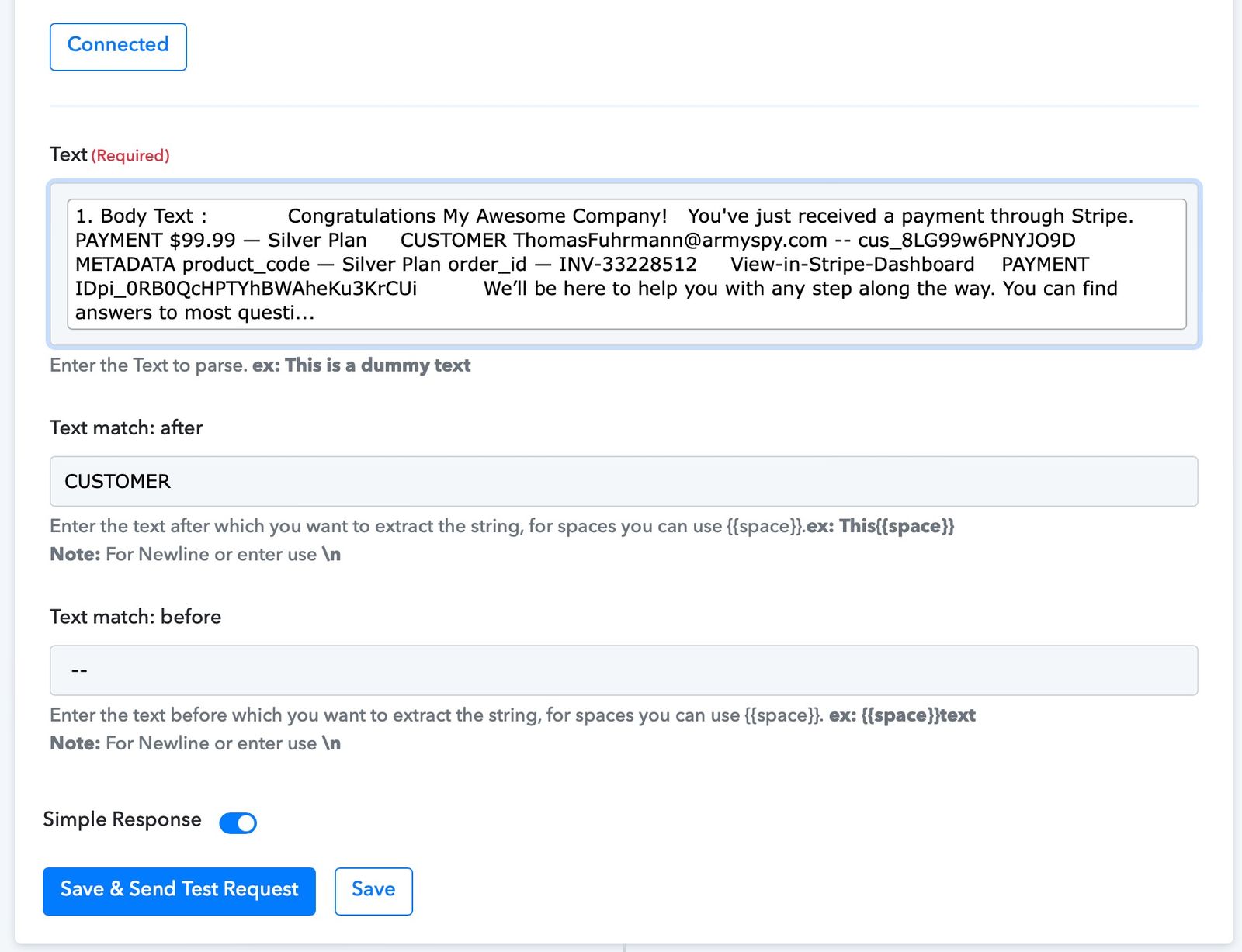 Unlike the Pabbly Email parser that can be utilized by Pabbly connect users, Parsio is a dedicated template-based parser where you simply have to highlight the type of data you want to extract, and the template is automatically created. This template can be altered and updated easily as compared to the rule-based parser Pabbly, which consumes time and is relatively complex.