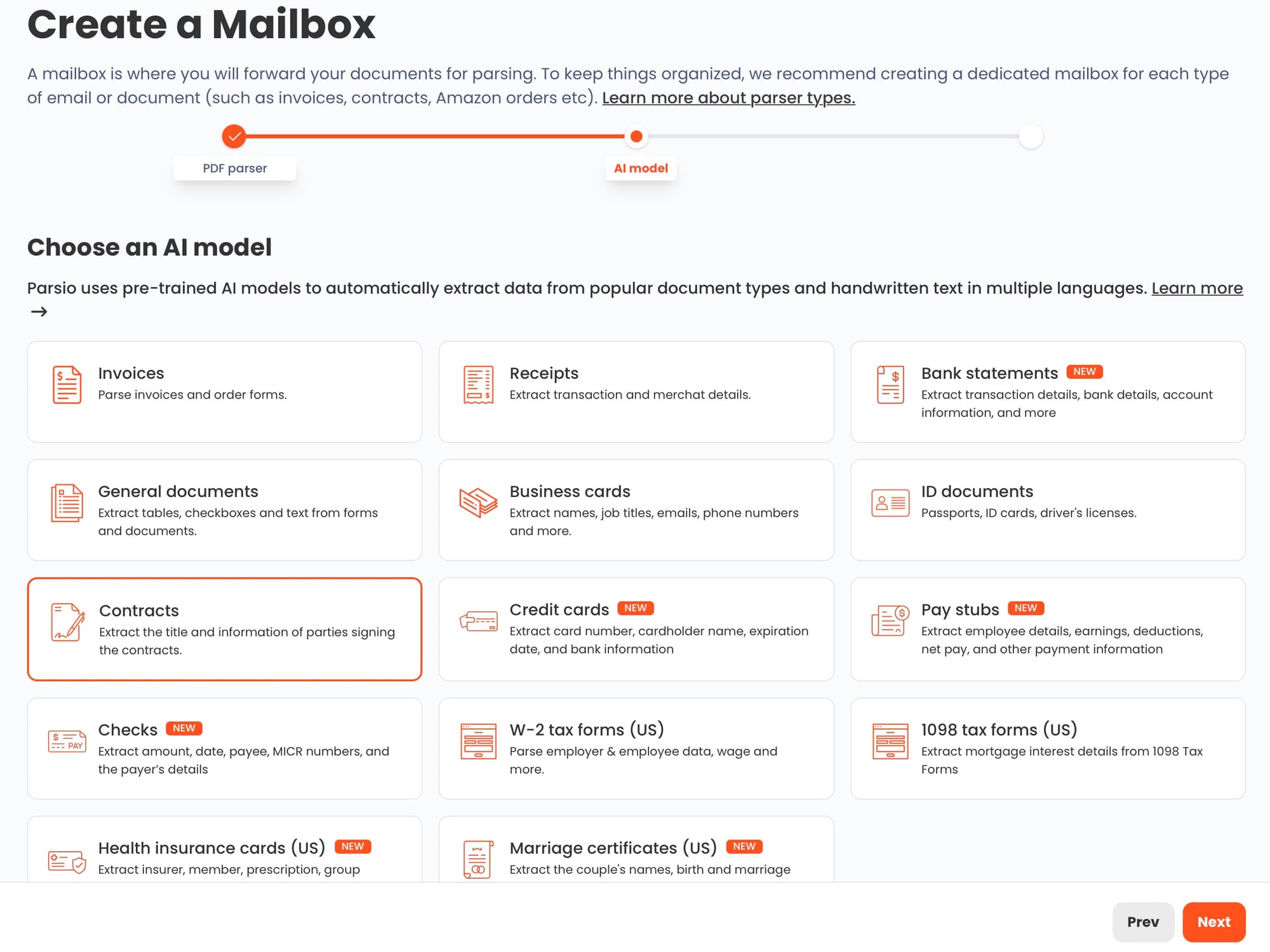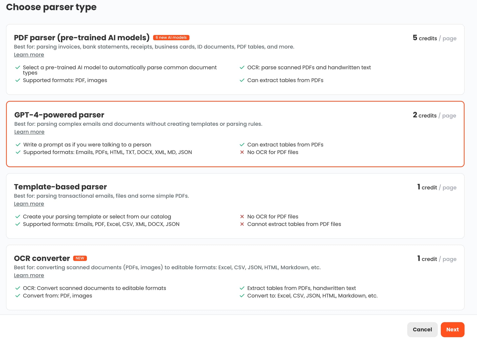 - Select the AI-powered parser and choose the relevant pre-trained model.