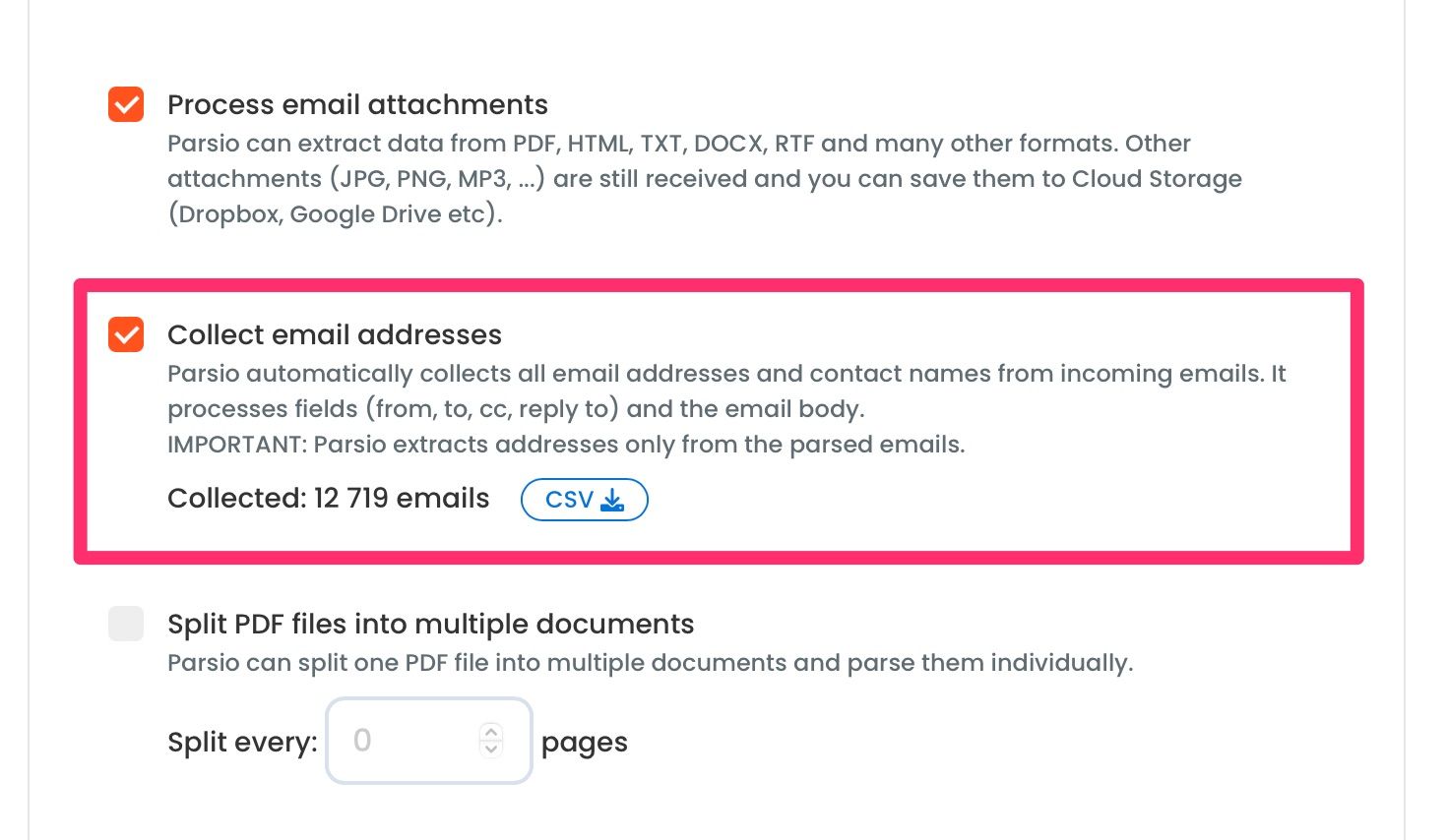 It all starts with creating a special mailbox at Parsio where you can auto forward emails and upload files manually or by means of API. As mentioned before, Parsio isn't limited to that: it comes with a dedicated feature that can analyze the incoming documents and auto extract the retrieved email addresses. The scraping tool can analyze incoming emails and attachments like PDF, Excel, Word, TXT, etc., and not only extract data from them but also harvest all the email addresses. Then the scraped emails can be downloaded as CSV files to be later imported to a CRM database or any marketing platform of your choice.