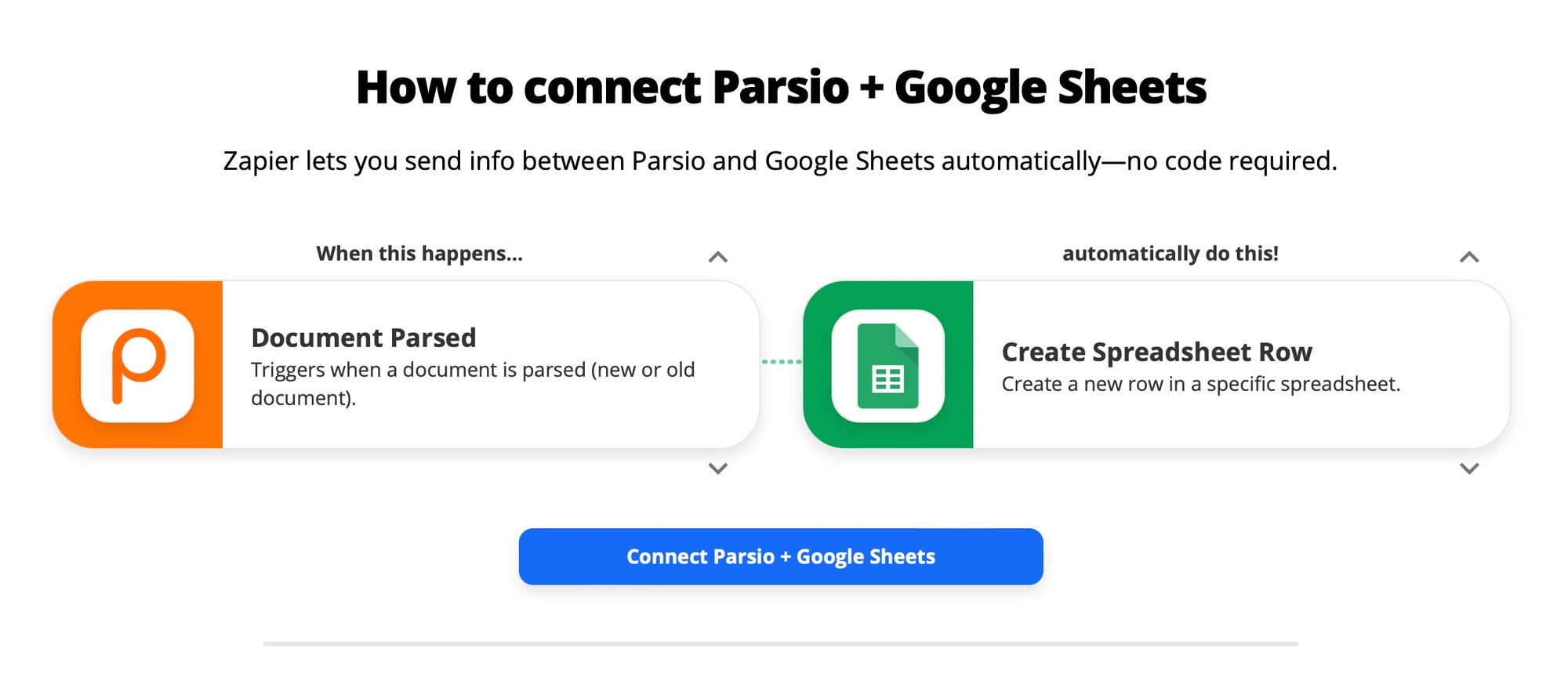 Alternatively, you can use an automation platform like Zapier, Integrately, Integromat (evolved to Make), Quickwork, KonnectzIt, Pabbly Connect. Parsio has a native integration with all of these services so the whole process won’t take you more than 2 minutes.