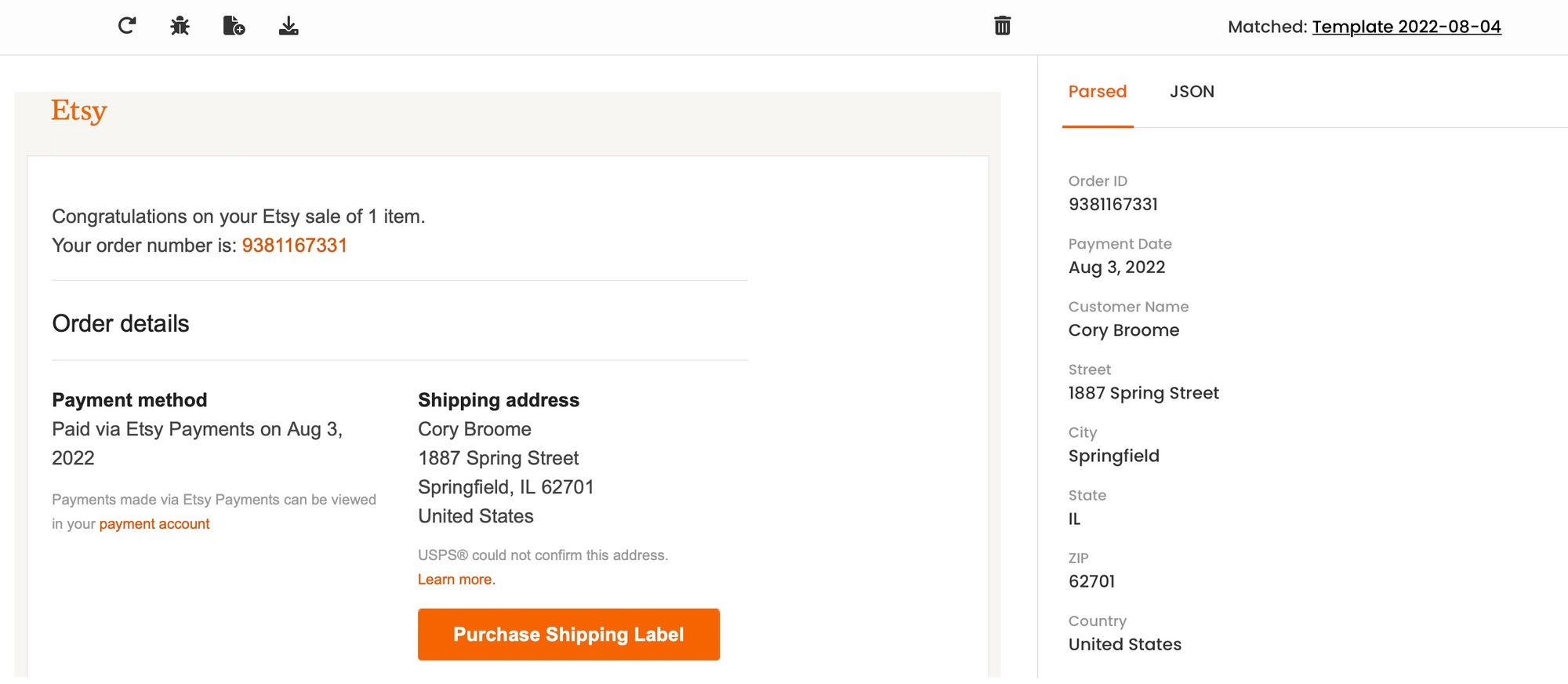Parsio Email Data Extraction for Etsy