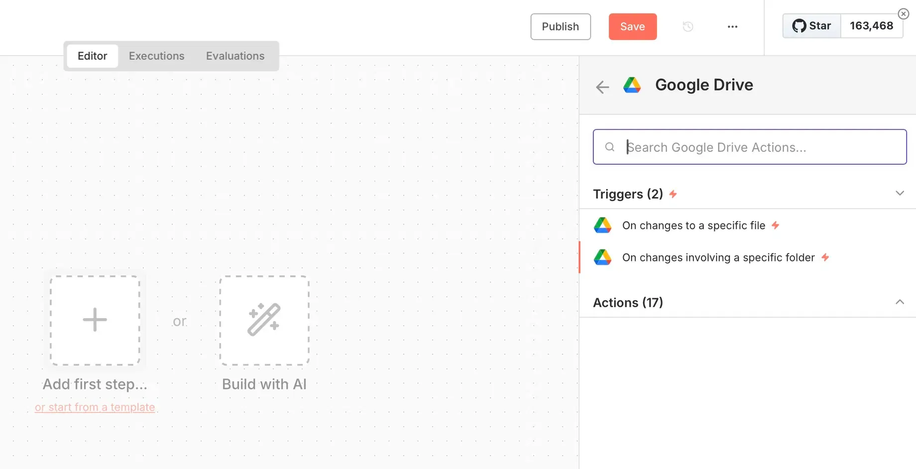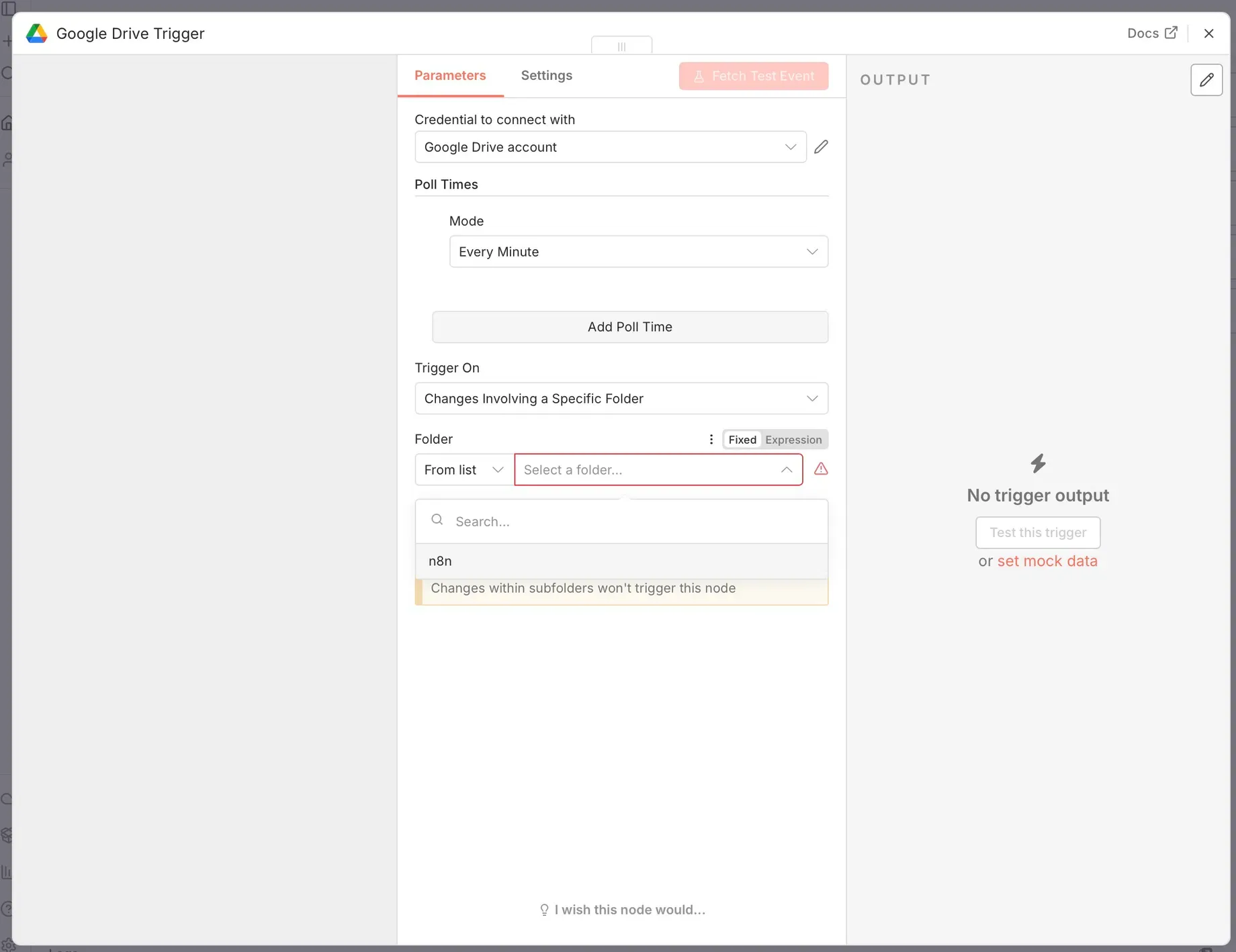 In n8n, create a new workflow and add a Google Drive trigger node: