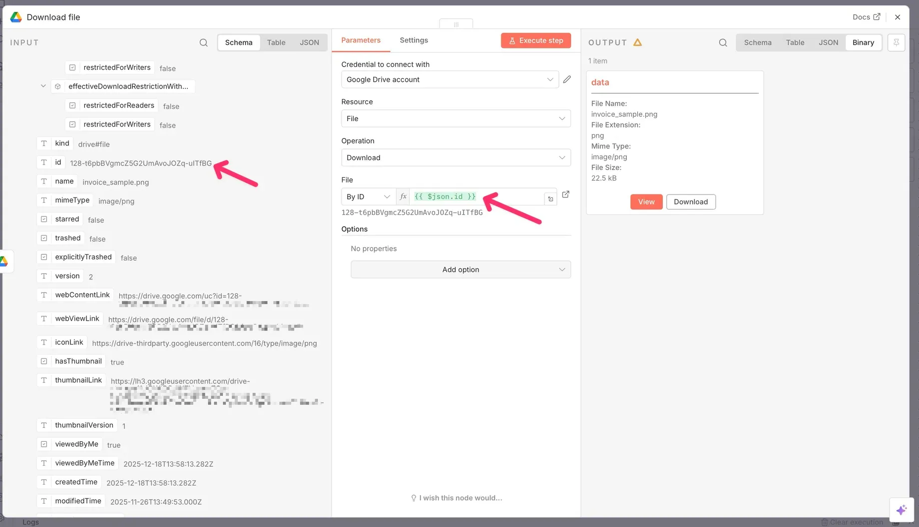 {{ $json.id }}— this ensures the workflow downloads the exact file that triggered the event.