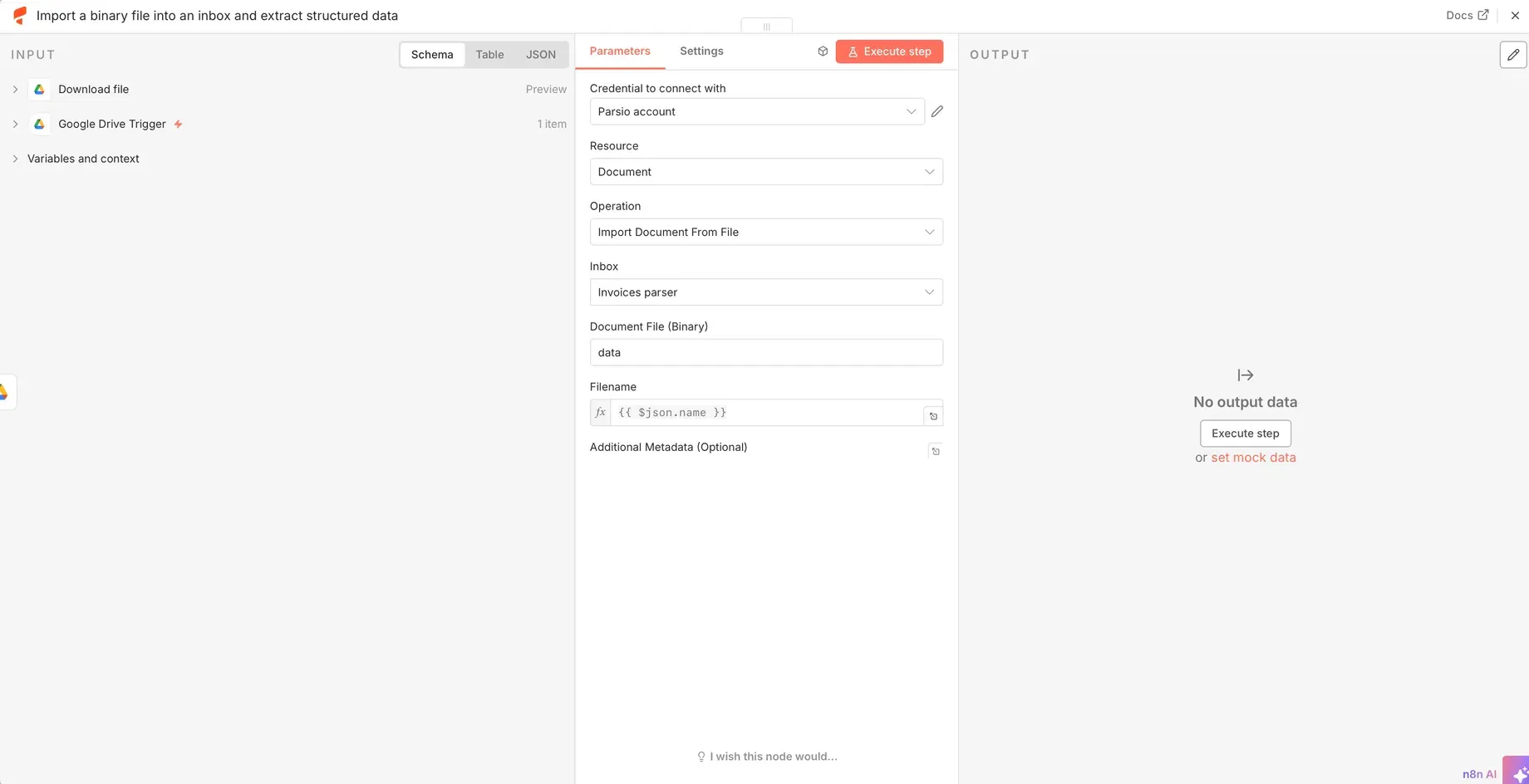 In this article, we’ll walk through how to connect Parsio with the open-source automation platform n8n to build powerful document workflows — including an example that automatically imports files from Google Drive into Parsio for parsing.