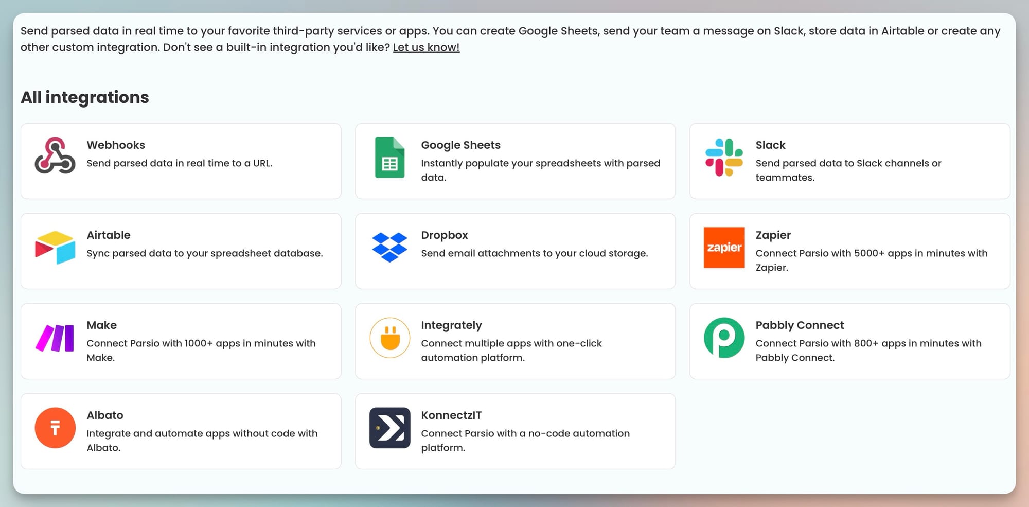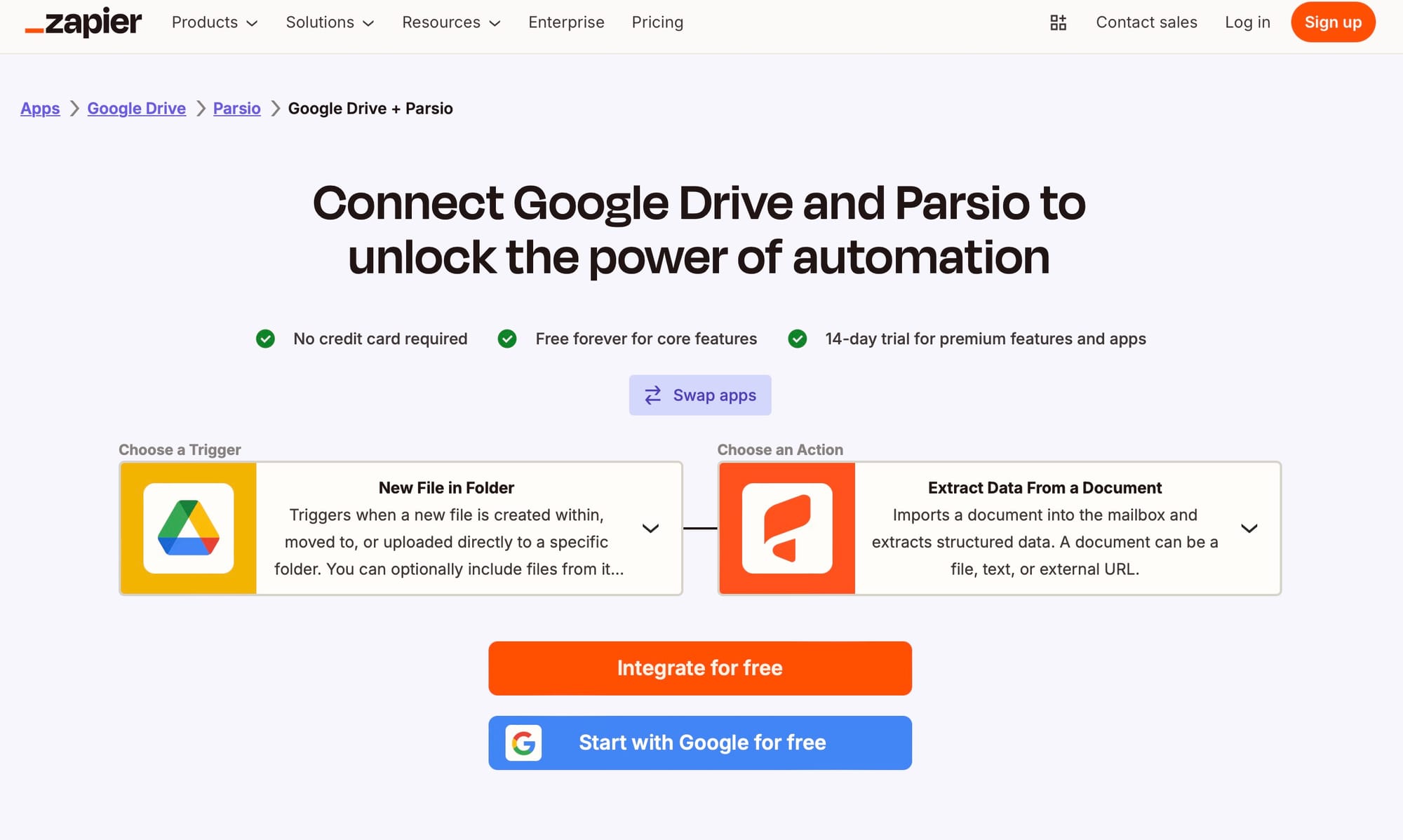 Parsio doesn’t connect to Drive directly inside the app. Instead, it uses automation platforms like Zapier or Make(formerly Integromat). These tools watch a Google Drive folder for new files and send them to Parsio automatically.
