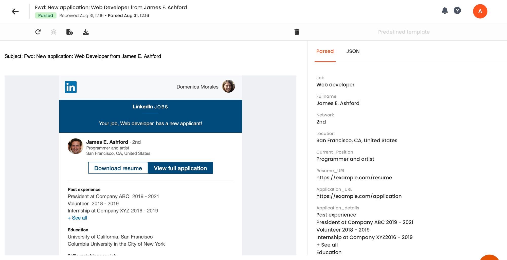 Simply select the data you want to extract, and the template is automatically created without writing a single line of code. Alternatively, you can use our ready-made LinkedIn template. Parsio is able to extract data from some popular platforms, including LinkedIn, which will allow you automatically parse all the incoming emails.