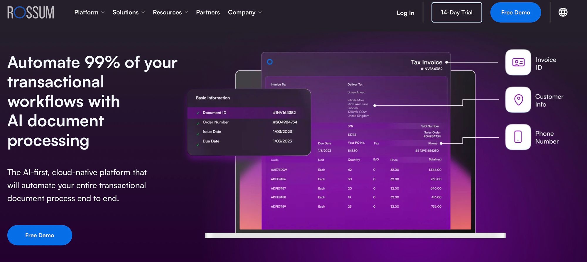 Rossum is an OCR document processing platform designed to help businesses extract structured and semi-structured data from a variety of documents. It is particularly useful for tasks such as processing invoices, extracting data from PDF files, and handling scanned documents, allowing users to export the extracted data to different formats.