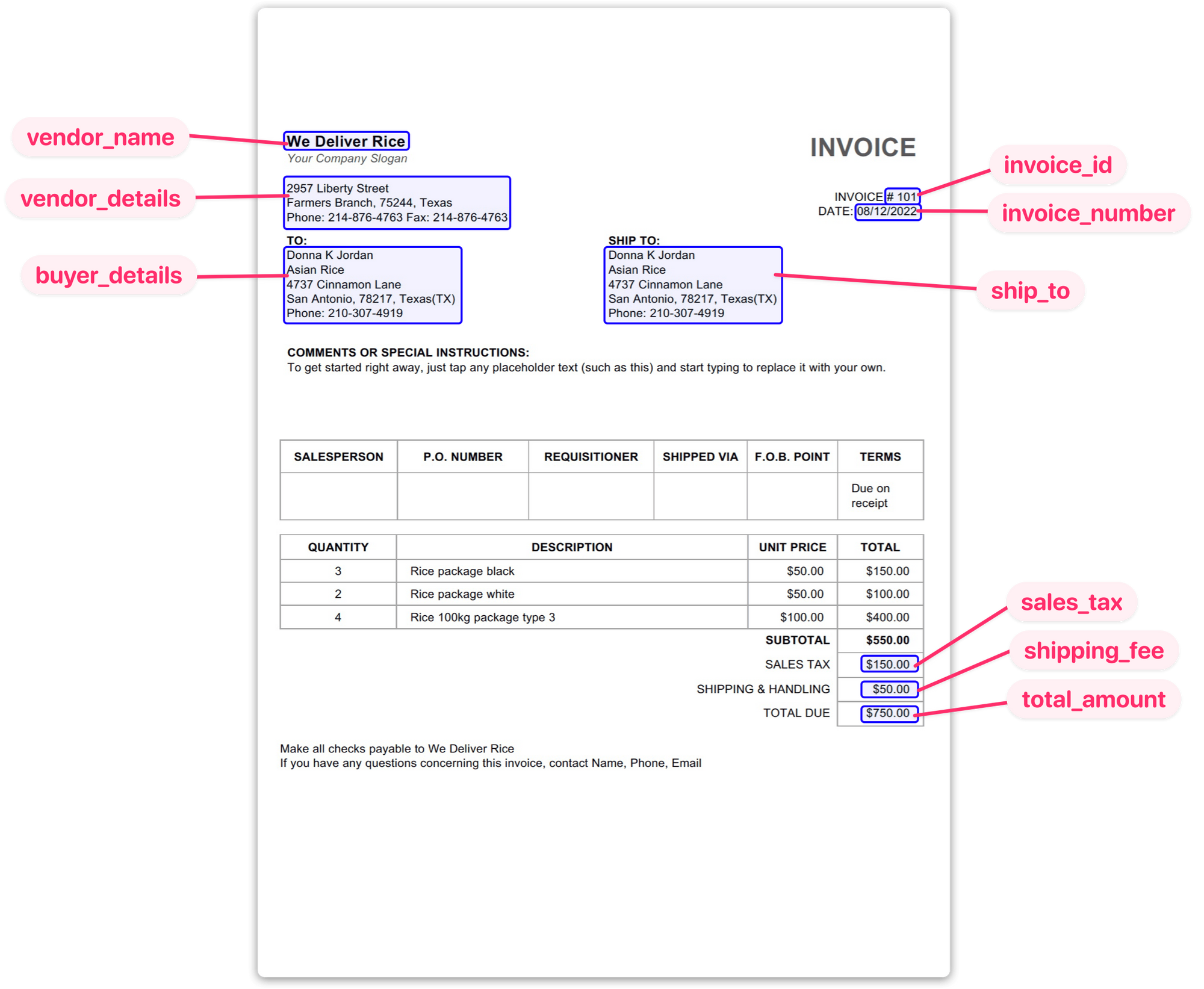 The first step in Zonal OCR is to segment the document into distinct zones based on its layout and structure. This segmentation process involves identifying and delineating areas of interest within the document, such as text fields, tables, headers, footers, or any other relevant sections. Users can assign a label to each zone. For instance, with invoices: users can have the following labels for various zones - invoice_id, vendor_name, total_amount, products_table, tax_rate.